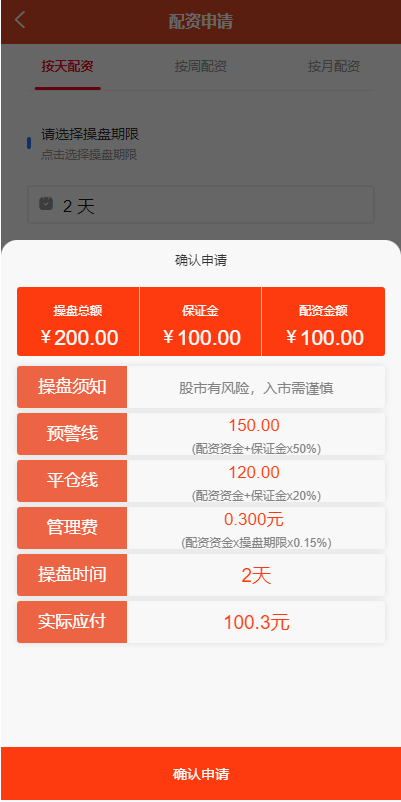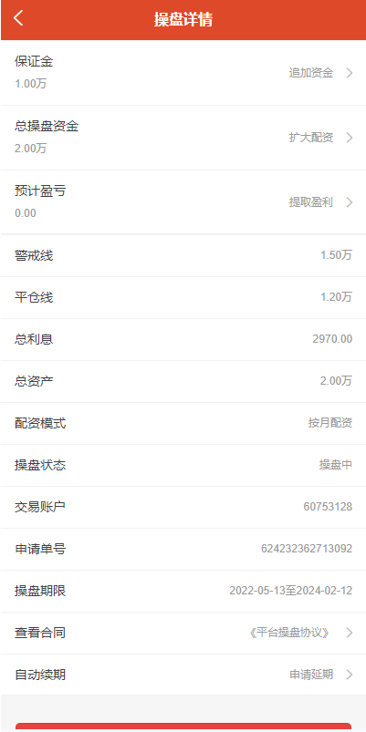 系统设有预警线自动平仓线,可按天配资,按周配资,按月配资,到期之后自动延期扣除手续费即可