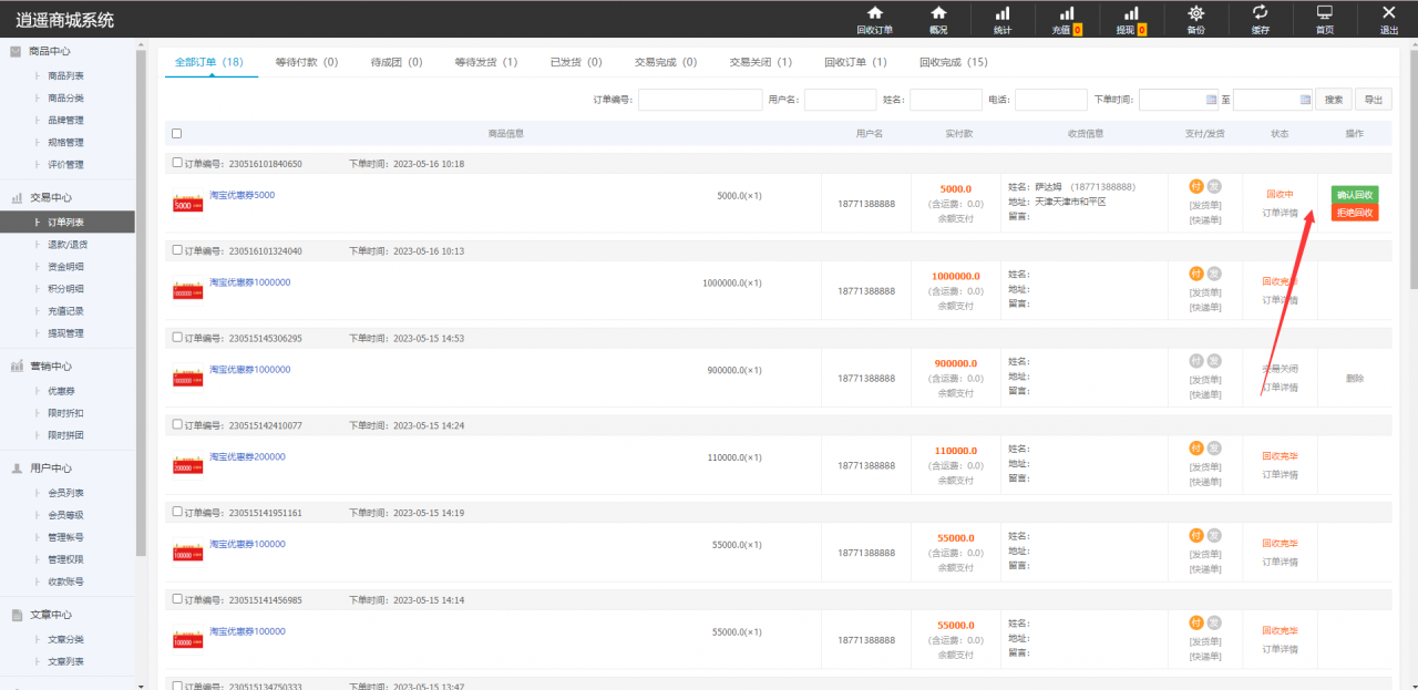 回收系统直接集成系统不需要二开搭建,前台提交后台订单直接回收,新增功能每个商品可设置回收折扣